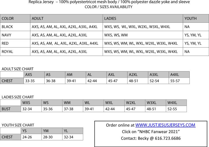 > NHBC Fanwear Size / Color Chart
