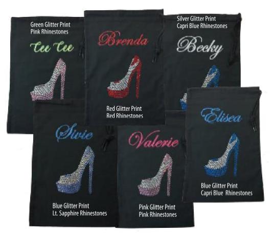 Personalized Rhinestone Black Shoe Bag. (100% Cotton Sheeting * Dimensions: 15.75"h x 11"w * Drawcord Closure)